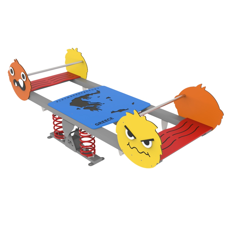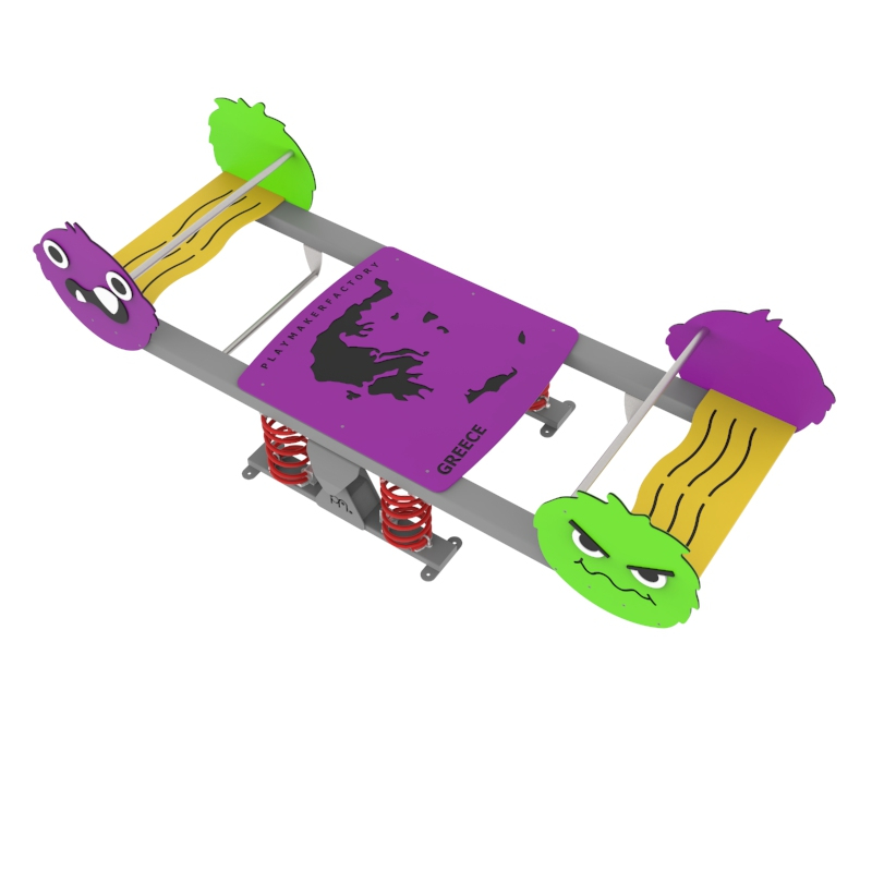 Μεταλλική τραμπάλα τεσσάρων θέσεων η οποία διαθέτει 2 καθίσματα απο HDPE (υψηλής πυκνότητας πολυαιθυλένιο), υψηλής πυκνότητας και αντοχής.