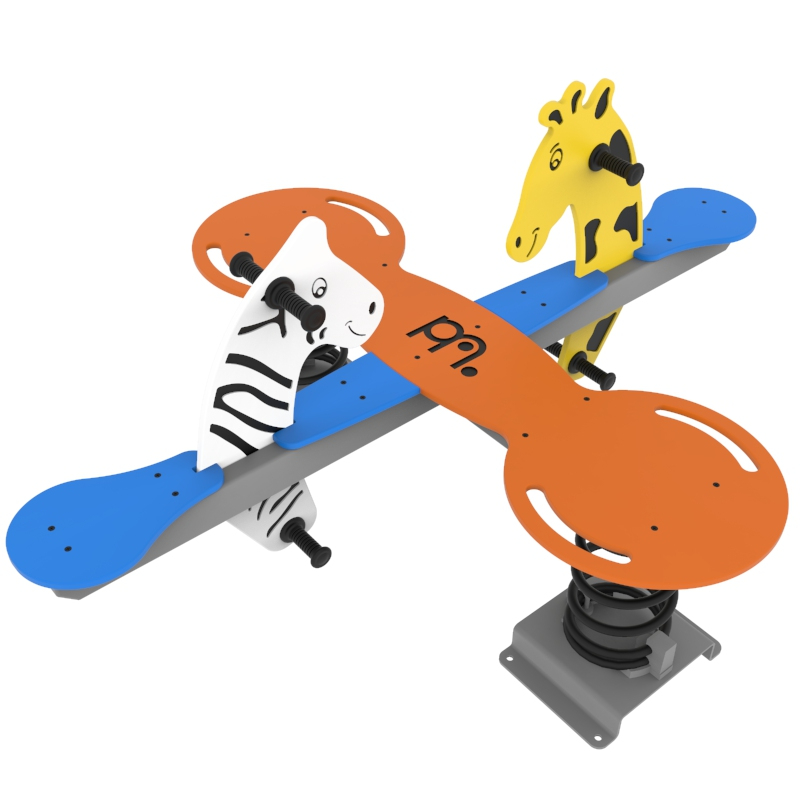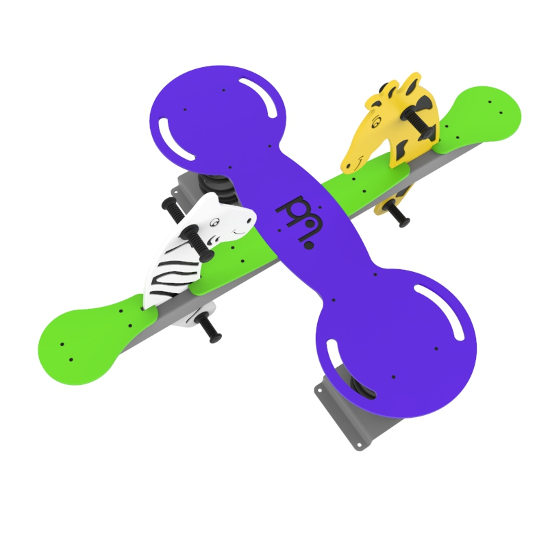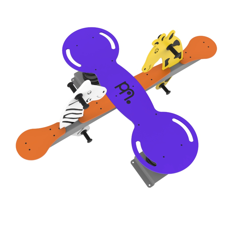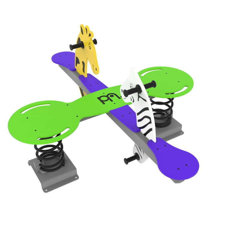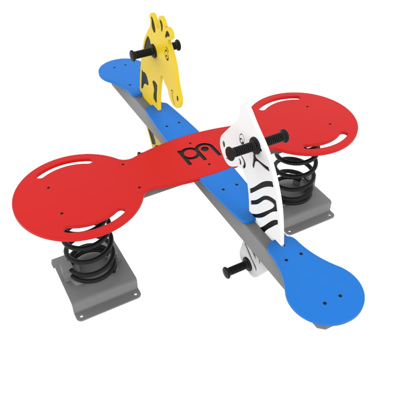 Μεταλλική τραμπάλα 4 θέσεων η οποία διαθέτει 4 καθίσματα και δύο μορφές ζωάκι απο HDPE (υψηλής πυκνότητας πολυαιθυλένιο), υψηλής πυκνότητας και αντοχής. Τα μεταλλικά μέρη είναι βαμμένα ηλεκτροστατικά για μέγιστη αντοχή στις καιρικές συνθήκες. Κατασκευασμένο σύμφωνα με το πρότυπο ΕΝ 1176. Κατάλληλο για ιδιωτική και δημόσια παιδική χαρά σύμφωνα με την ισχύουσα νομοθεσία. Υπάρχει δυνατότητα επιλογής χρώματος και μετάλλου.