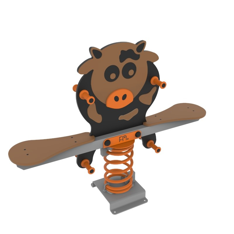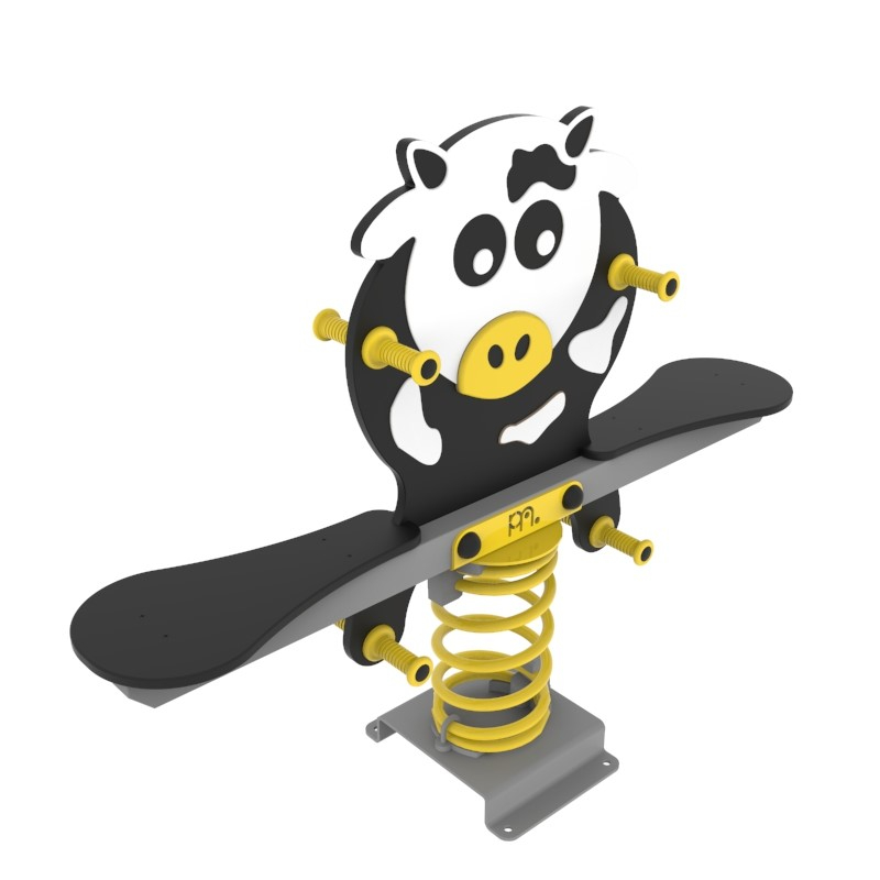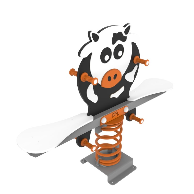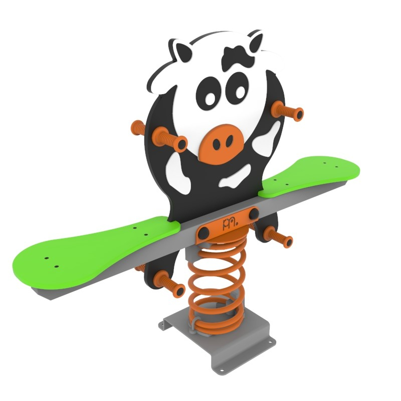 Μεταλλική τραμπάλα 2 θέσεων η οποία διαθέτει 2 καθίσματα και μια μορφή "αγελάδας" απο HDPE (υψηλής πυκνότητας πολυαιθυλένιο), υψηλής πυκνότητας και αντοχής. Τα μεταλλικά μέρη είναι βαμμένα ηλεκτροστατικά για μέγιστη αντοχή στις καιρικές συνθήκες. Κατασκευασμένο σύμφωνα με το πρότυπο ΕΝ 1176. Κατάλληλο για ιδιωτική και δημόσια παιδική χαρά σύμφωνα με την ισχύουσα νομοθεσία. Υπάρχει δυνατότητα επιλογής χρώματος και μετάλλου.
