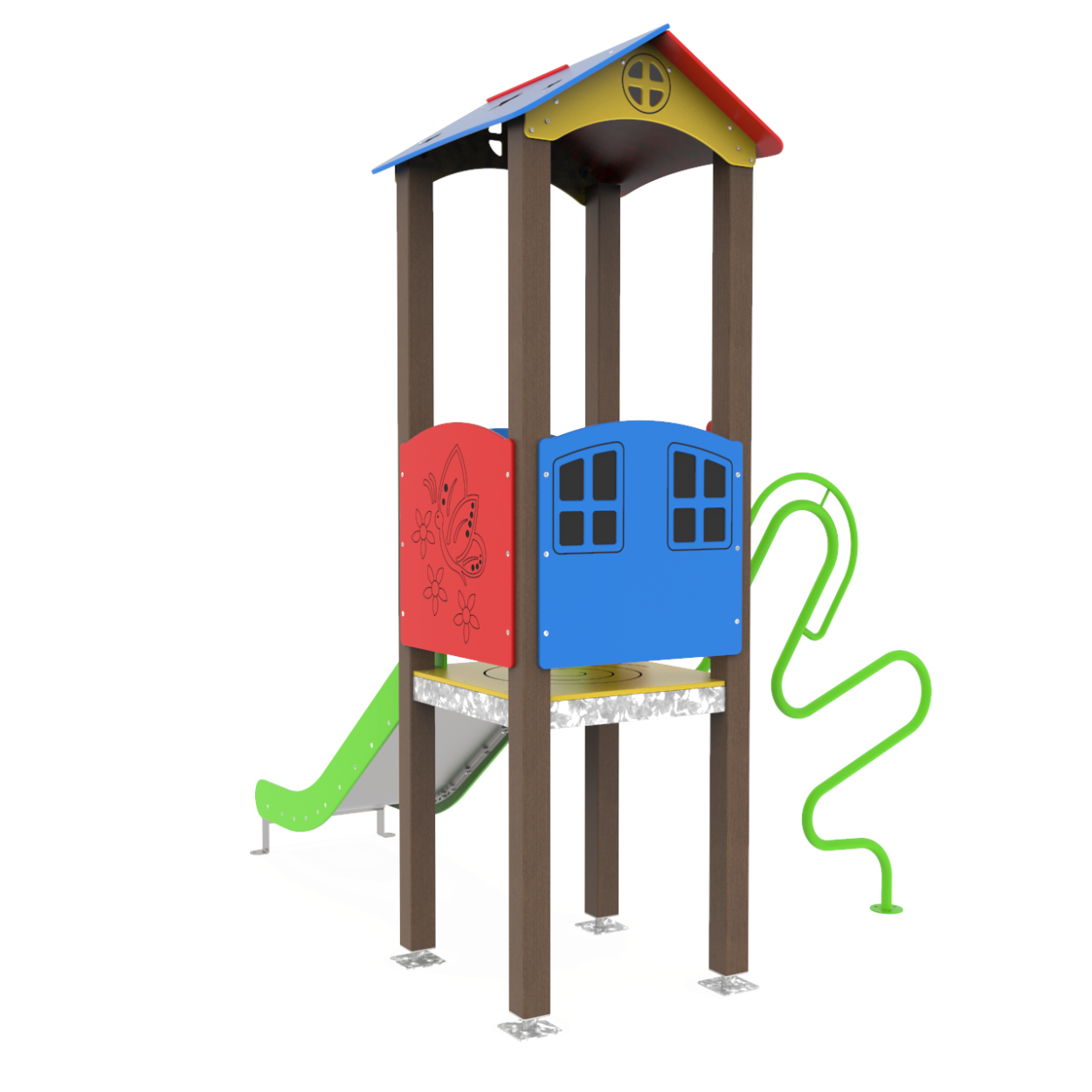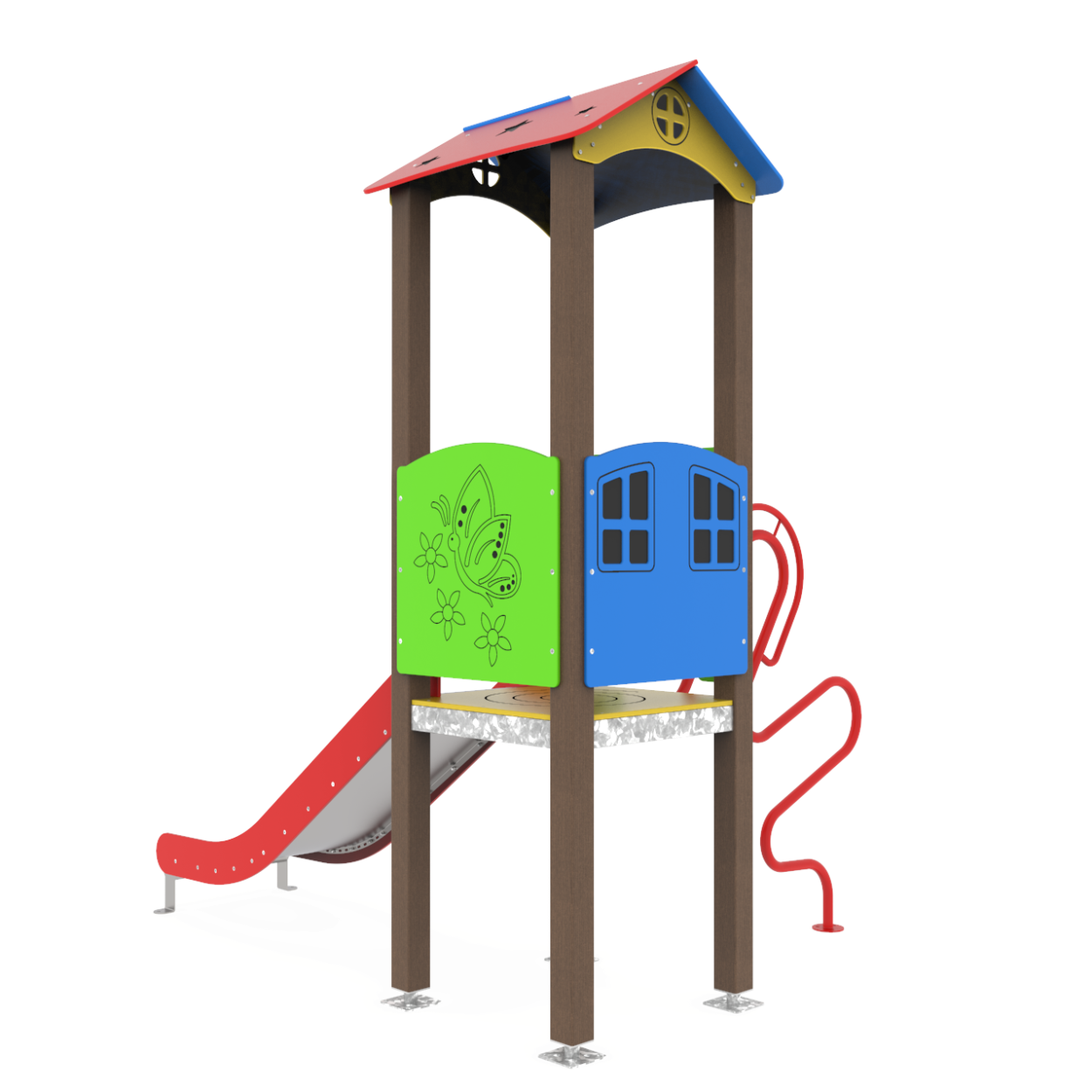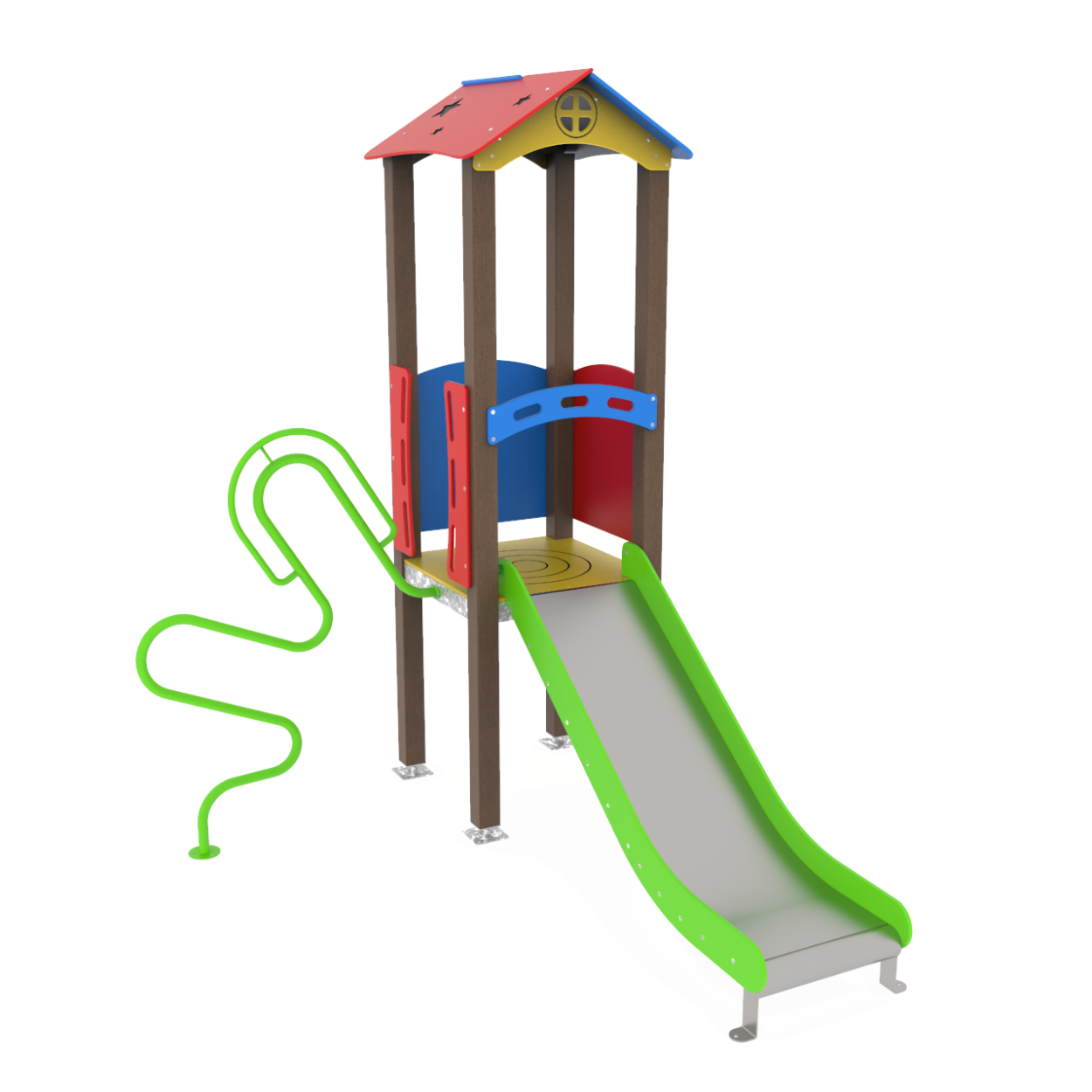Απλό συγκρότημα που αποτελείται από μεταλλική αναρρίχηση, τετράγωνο πατάρι με σκέπαστρο και τσουλήθρα. Διατίθεται σε διαφορετικούς χρωματισμούς.