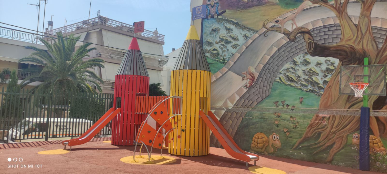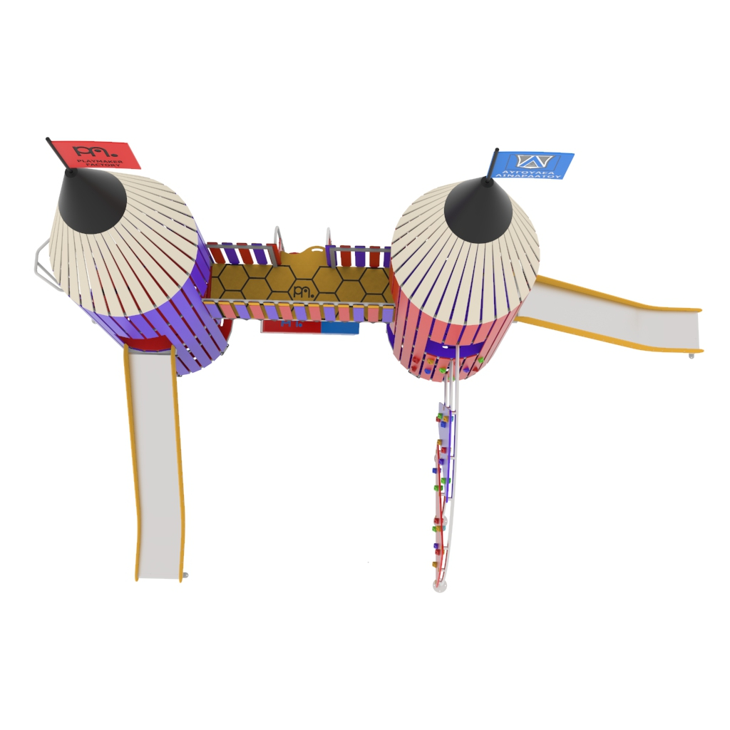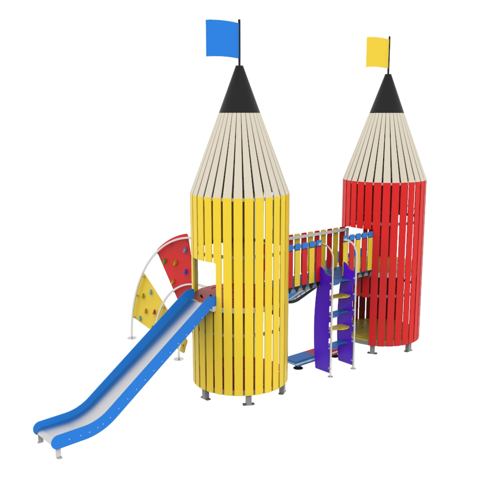 Μεταλλικό σύνθετο συγκρότημα ,αποτελούμενο από δύο πύργους σε σχήμα μολυβιού επενδεδυμένους από φύλλα HDPE, πάνελ αναρρίχησης από HDPE, στύλο ολίσθησης πυροσβέστη και δύο τσουλήθρες. Δυνατότητα επιλογής χρώματος και μετάλλου.